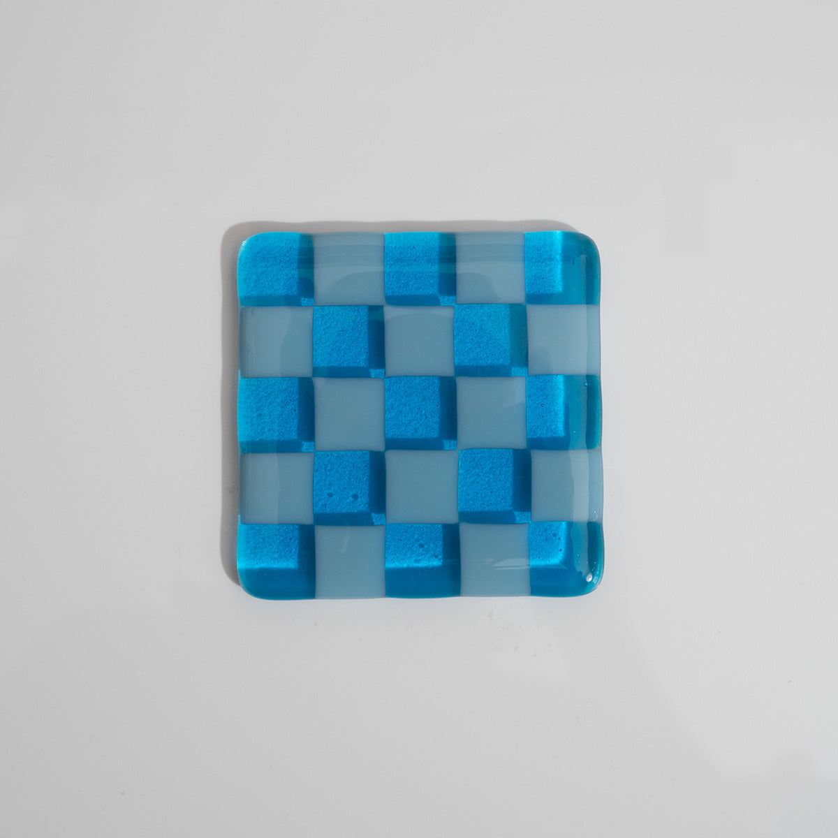 Adding a dash of warmth and colour to any room, this coaster has been created with alternating opaque powder bluer and transparent turquoise blue glass. These 2cm glass squares have been arranged to create a checkerboard pattern atop a clear glass base before being fired and fused at temperatures of 800°c.