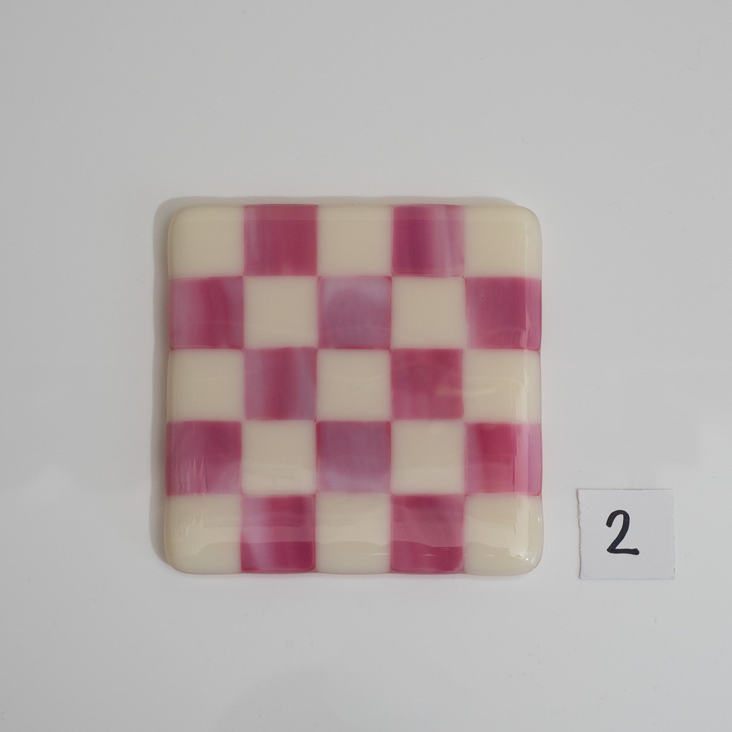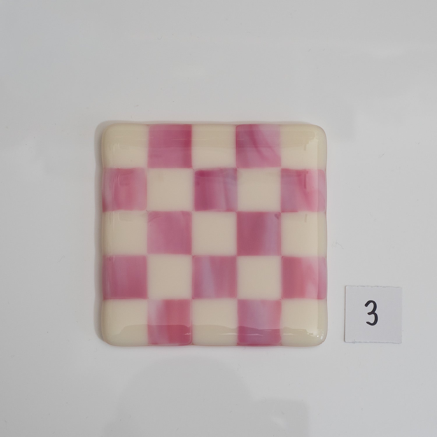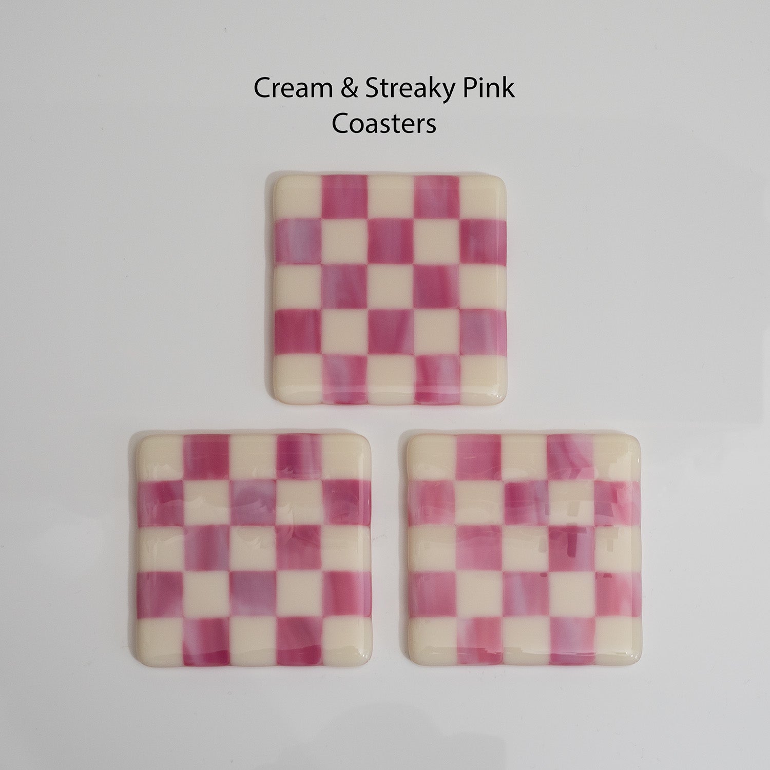 Bullseye - Cream & Streaky Pink Chequered Fused Glass Coaster
