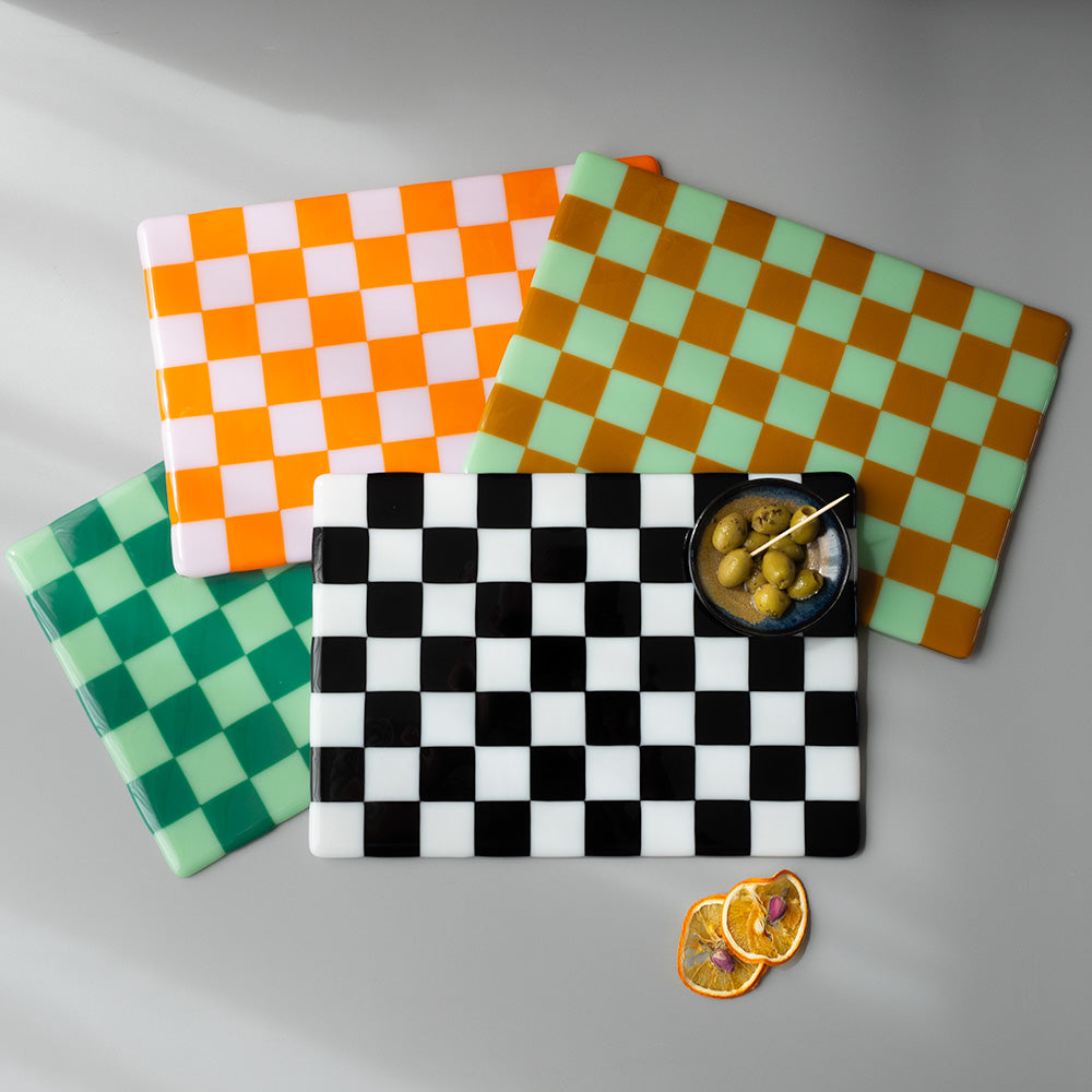 These placemats have been made with alternating hand cut glass squares and arranged neatly into a chequered pattern with a layer of clear glass underneath and fused together flat in the kiln to just over 800°c.