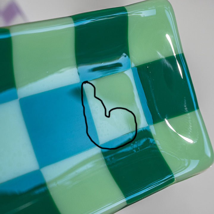1. This tray has patches of Devitrification (aka devit) on some of the light green squares which look like cloudy patches/fingerprint smudges in certain angles of light that cannot be cleaned off - this occurs sometimes as the molecules in the glass change their structure into that of crystalline solids (please see circled photo as example). This really only shows slightly when angled in certain light positions and struggled to even take a photo of it showing. There are 6 available that all have similar issues.