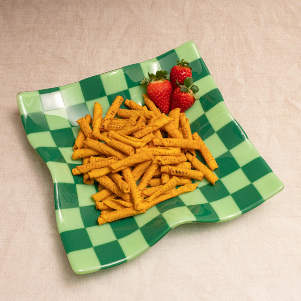 These serving bowls have been made with alternating hand cut glass squares and arranged neatly into a chequered pattern with a layer of clear glass on top and fused together flat in the kiln to just over 800°c. The flat glass is then placed onto a wavy mould and kiln fired once more to take the shape of the mould (slumping) creating these gorgeous wavy/crumpled bowl.