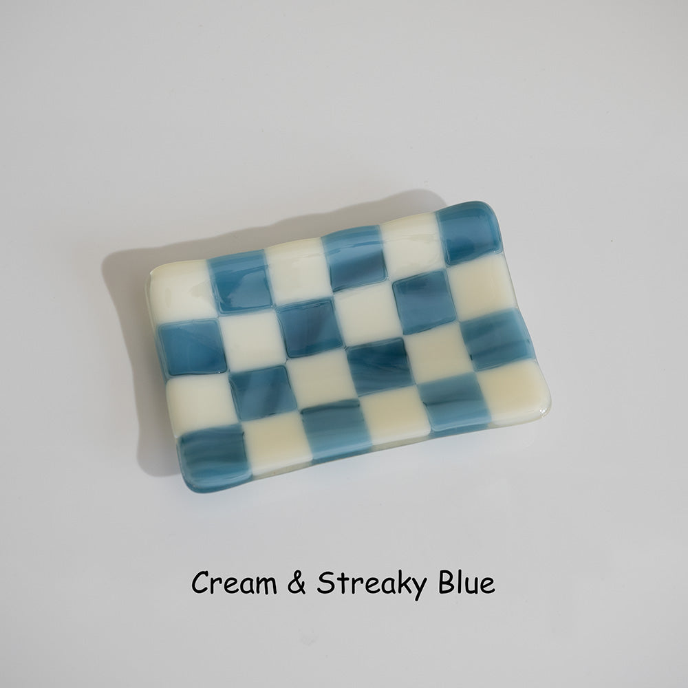 Bullseye - Cream & Streaky Blue Chequered Fused Glass Small Tray